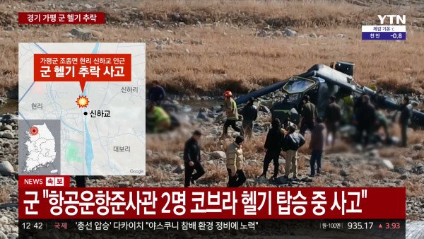 9일 오전 경기 가평군 조종면 현리 일대에서 군 헬기 1대가 추락해 탑승자 2명이 중상을 입고 의식불명 상태에 빠졌다. 군과 소방당국에 따르면 이날 오전 11시 4분쯤 가평군 조종면 현리 신하교 인근 하천변에서 군