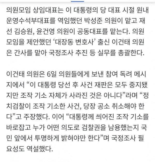 상임대표는 박성준 의원이, 공동대표는 김승원·윤건영 의원이 각각 맡는다. 모임을 제안한 이건태 의원은 간사로 실무를 총괄할 예정이다.
