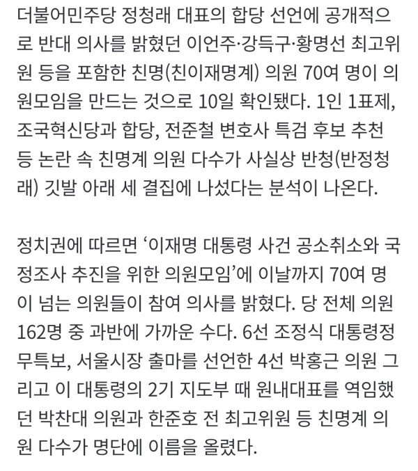 더불어민주당 정청래 대표의 합당 선언에 공개적으로 반대 의사를 밝혔던 이언주·강득구·황명선 최고위원 등을 포함한 친명(친이재명계) 의원 70여 명이 의원모임을 만드는 것으로 10일 확인됐다. 1인 1표제, 조국혁신당