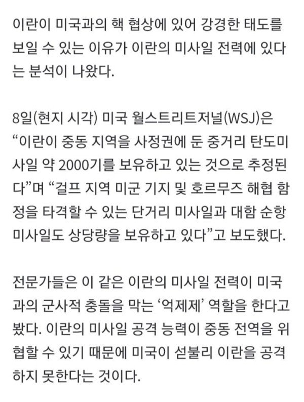 이란이 미국과의 핵 협상에 있어 강경한 태도를 보일 수 있는 이유가 이란의 미사일 전력에 있다는 분석이 나왔다. 8일(현지 시각) 미국 월스트리트저널(WSJ)은 “이란이 중동 지역을 사정권에 둔 중거리 탄도미사일 약