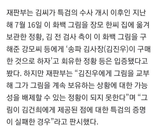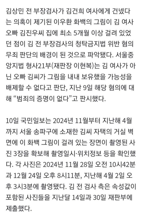 김상민 전 부장검사가 김건희 여사에게 건넸다는 의혹이 제기된 이우환 화백의 그림이 김 여사 오빠 김진우씨 집에 최소 5개월 이상 걸려 있었던 점이 김 전 부장검사의 청탁금지법 위반 혐의 무죄 판단의 배경이 된 것으로