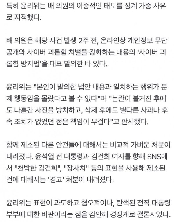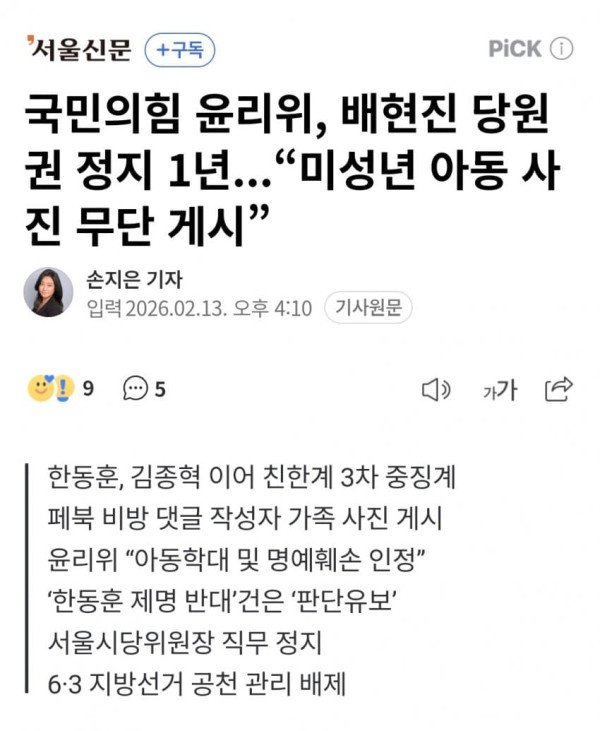 국민의힘 중앙윤리위원회(이하 윤리위)가 13일 배현진 의원에 대해 '당원권 정지 1년'의 중징계 처분을 내렸다. 윤리위는 배 의원이 SNS상 설전 과정에서 일반인 미성년자의 사진을 무단으로 게시한 행위를 '디지털 아