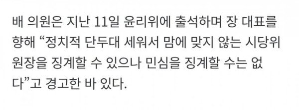 한상희 김일창 기자 = 국민의힘 중앙윤리위원회는 13일 배현진 의원에게 당원권 정지 1년의 징계를 내렸다. 중앙윤리위는 이날 오후 언론에 배포한 결정문에서 배 의원과 관련해 제소된 4건의 안건을 심의·의결한 결과,