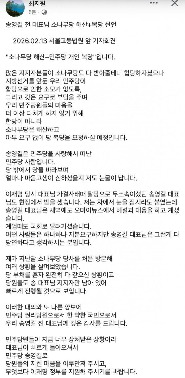 속보 - 송영길 "소나무당 해체하고 개별적으로 민주당 입당하겠다"
