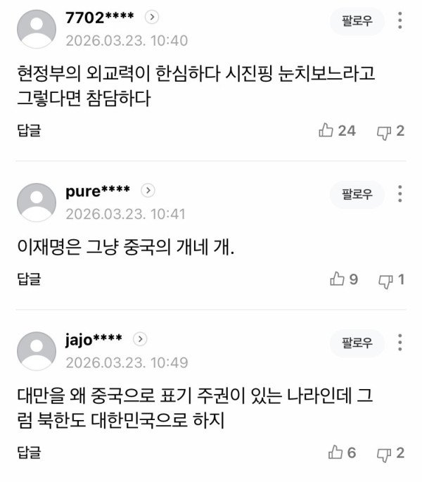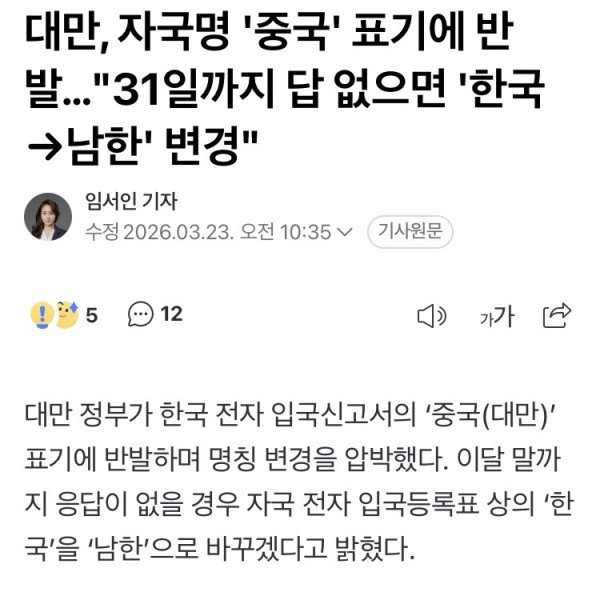 대만 "31일까지 응답 없으면 한국 아닌 '남한' 표기"