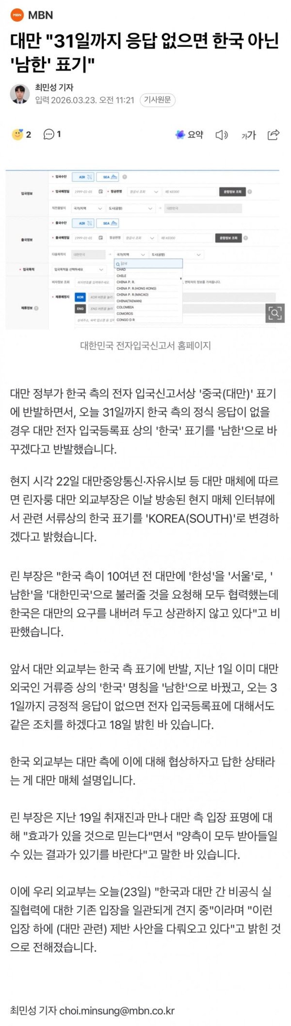 대만 정부가 한국 측의 전자 입국신고서상 '중국(대만)' 표기에 반발하면서, 오늘 31일까지 한국 측의 정식 응답이 없을 경우 대만 전자 입국등록표 상의 '한국' 표기를 '남한'으로 바꾸겠다고 반발했습니다. 현지 시