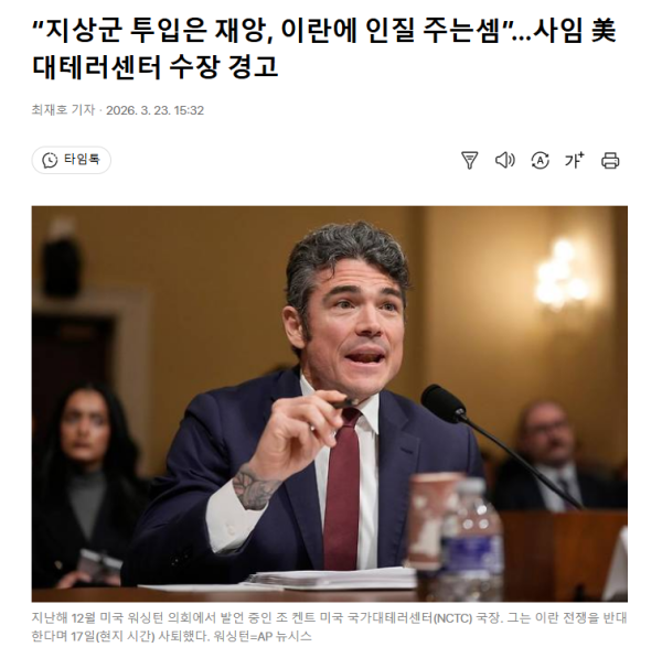지난해 12월 미국 워싱턴 의회에서 발언 중인 조 켄트 미국 국가대테러센터(NCTC) 국장. 그는 이란 전쟁을 반대한다며 17일(현지 시간) 사퇴했다. 워싱턴=AP 뉴시스 이란과의 전쟁에 반대하면서 사임한 조 켄트 전 미국 국가대테러센터(NCTC) 국장이 22일(현지 시간) 미국의 지상군 투입 가능성에 대해 우려를 표명했다. 그는 “사실상 (이란에게) 인