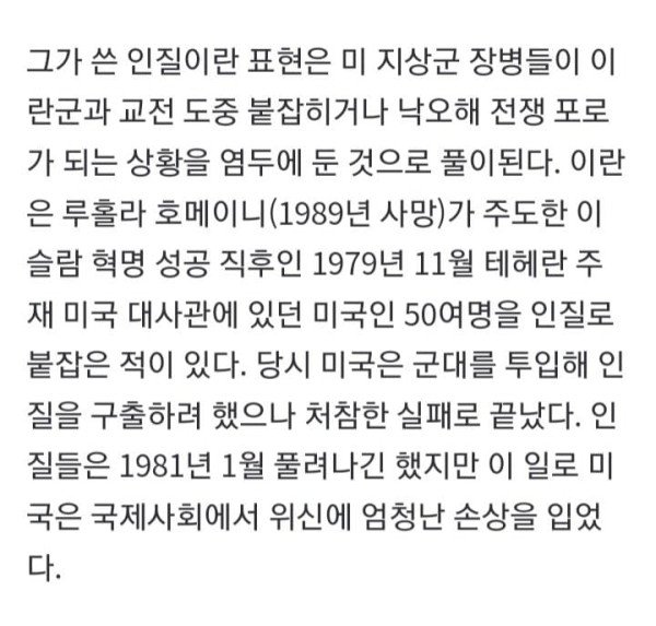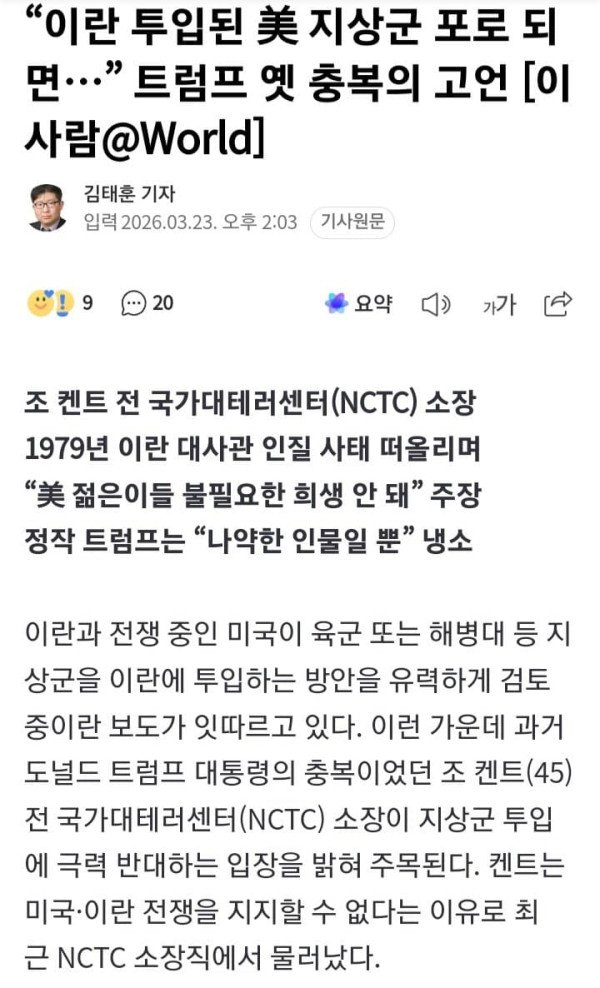 조 켄트 전 국가대테러센터(NCTC) 소장 1979년 이란 대사관 인질 사태 떠올리며 “美 젊은이들 불필요한 희생 안 돼” 주장 정작 트럼프는 “나약한 인물일 뿐” 냉소 이란과 전쟁 중인 미국이 육군 또는 해병대 등
