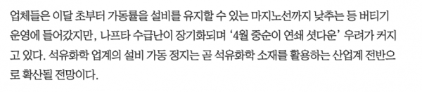지난달 28일 발발한 미국·이스라엘과 이란 간 전쟁 여파로 ‘나프타(납사)’ 수급에 차질이 생기면서 중소기업계가 직격탄을 맞았다. 특히 비닐 생산업체들은 치솟는 원료비와 재고 부족이라는 이중고에 시달리고 있다. 24