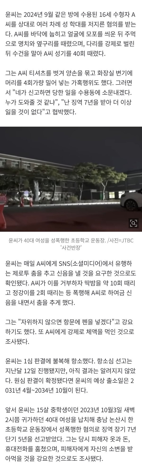 동료 수감자 협박, 폭행, 유사 강간하여 형량 늘어남