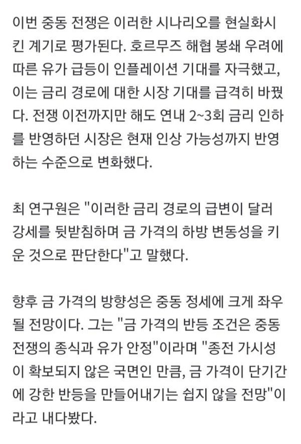 금 가격이 중동 지정학적 리스크와 글로벌 금융환경 변화 속에서 급등과 급락을 반복하며 높은 변동성을 보이고 있다. 단기적으로는 조정 압력이 이어지고 있지만, 구조적인 상승 흐름은 여전히 유효하다는 분석이 나온다. 최