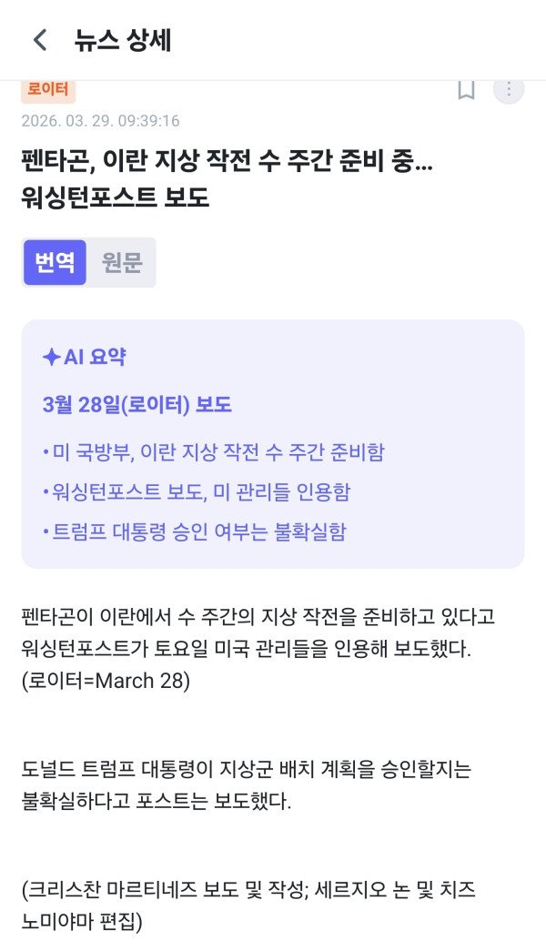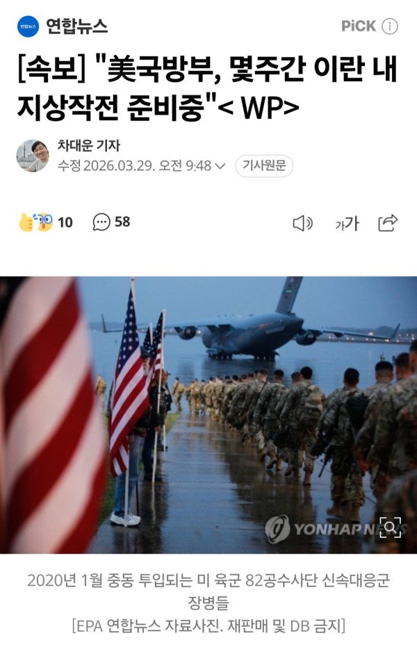 [속보] "美국방부, 몇주간 이란 내 지상작전 준비중"< WP>