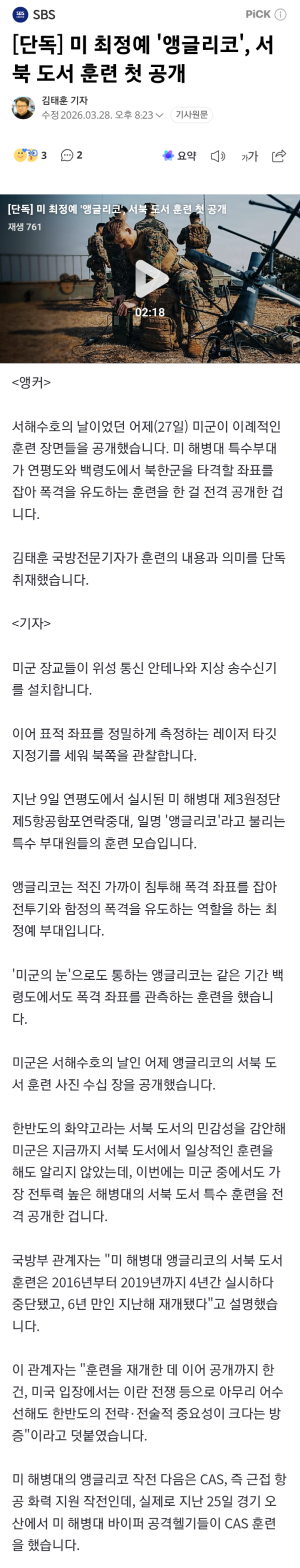 서해수호의 날이었던 어제(27일) 미군이 이례적인 훈련 장면들을 공개했습니다. 미 해병대 특수부대가 연평도와 백령도에서 북한군을 타격할 좌표를 잡아 폭격을 유도하는 훈련을 한 걸 전격 공개한 겁니다. 김태훈 국방전문