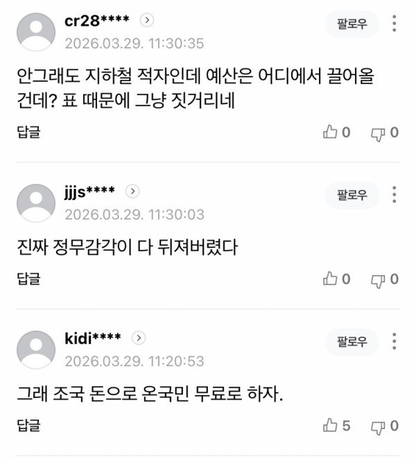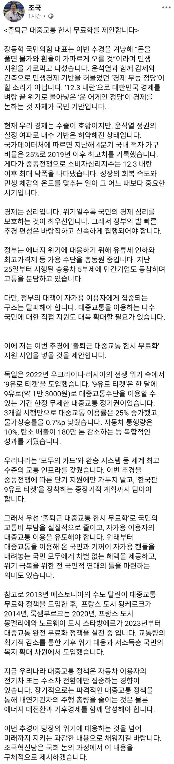 조국 "출퇴근 대중교통 한시 무료화를 제안한다"