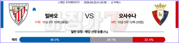 2026-04-22 라리가 아틀레틱 빌바오 CA 오사수나 해외축구분석 무료중계 스포츠분석