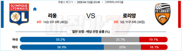 2026-04-13 리그앙 올랭피크 리옹 로리앙 해외축구분석 무료중계 스포츠분석