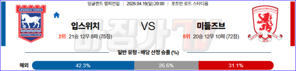 2026-04-19 잉글랜드 챔피언쉽 입스위치 타운 미들즈브러 FC 해외축구분석 무료중계 스포츠분석