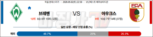 2026-05-02 분데스리가 SV 베르더 브레멘 아우크스부르크 해외축구분석 무료중계 스포츠분석