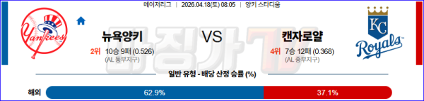 2026-04-18 MLB 뉴욕양키스 캔자스시티 MLB분석 무료중계 스포츠분석
