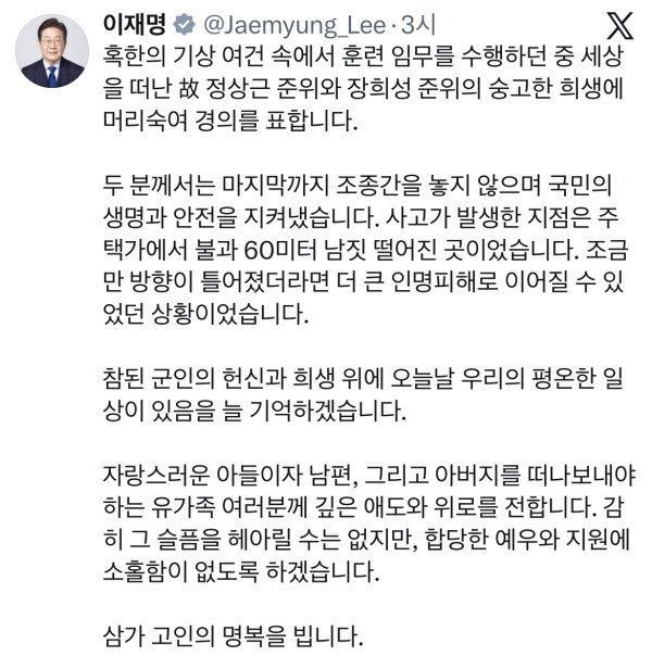 이재명 “조종간 놓지 않은 숭고한 희생” 헬기 추락 순직 장병 애도
