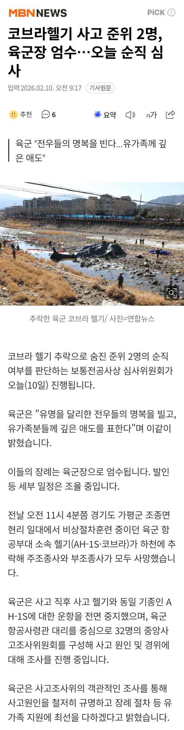 [속보] 육군 "훈련중 숨진 조종사 2명 '순직' 결정"