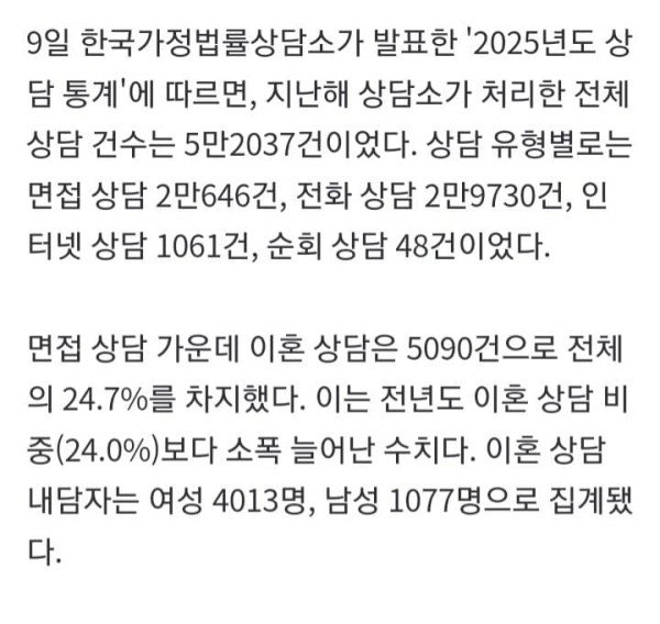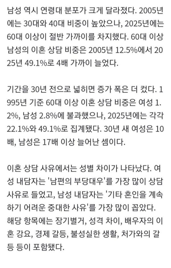 60대 이상 노년층의 이혼 상담 비중이 최근 20년 사이 크게 증가한 것으로 나타났다. 이혼 상담을 받은 내담자 가운데 최고령자는 남성 90세, 여성 88세였다. 9일 한국가정법률상담소가 발표한 '2025년도 상담