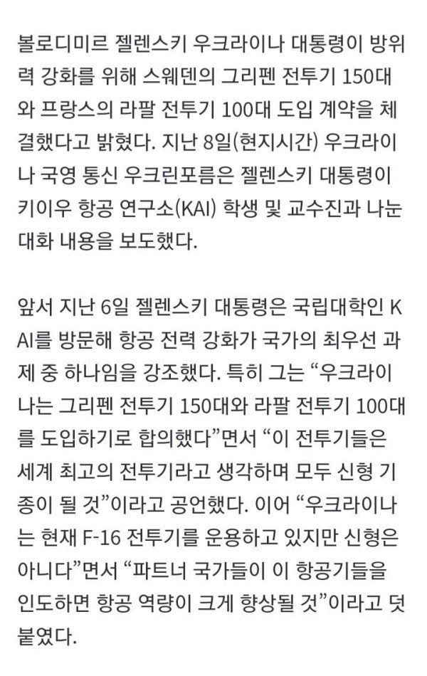 볼로디미르 젤렌스키 우크라이나 대통령이 방위력 강화를 위해 스웨덴의 그리펜 전투기 150대와 프랑스의 라팔 전투기 100대 도입 계약을 체결했다고 밝혔다. 지난 8일(현지시간) 우크라이나 국영 통신 우크린포름은 젤렌