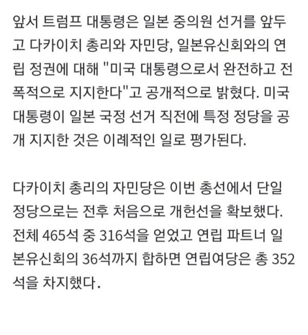 美트럼프 정부, 다카이치 자민당 압승 축하…