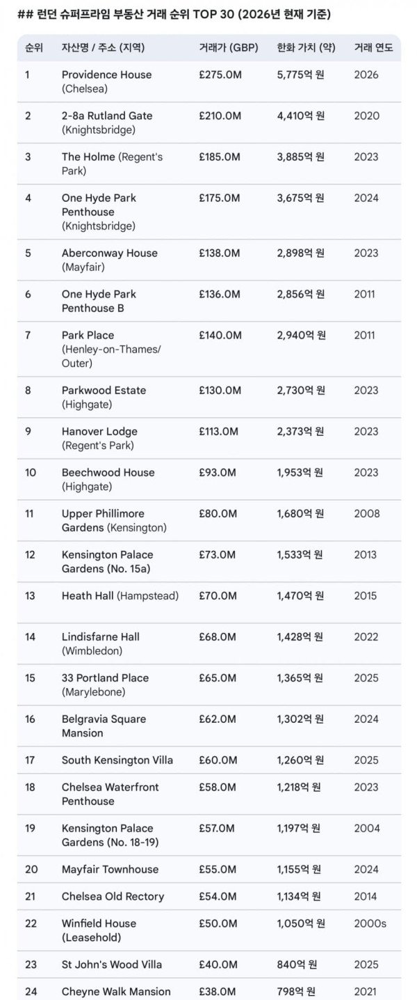 상위 럭셔리 주택들을 비교할땐 런던과 서울이 비교도 안되지만