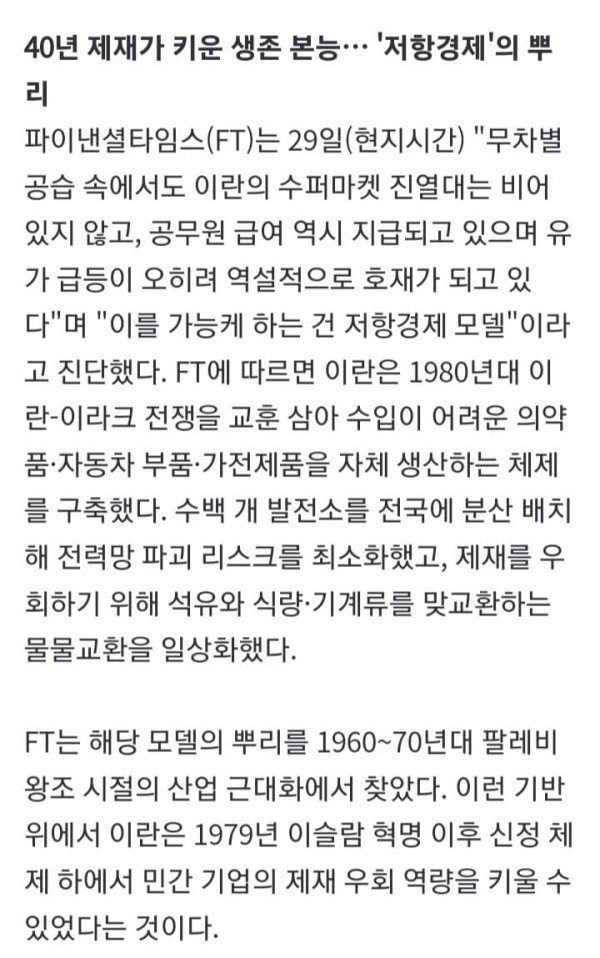 이란전쟁이 서로의 산업 인프라를 정조준하는 보복전 국면으로 확장되면서 1979년 이슬람 혁명 이후 40여 년간 이란이 쌓아올린 '저항경제'가 본격적인 시험대에 올랐다는 분석이 나온다. 저항경제를 지탱하는 산업 기반으