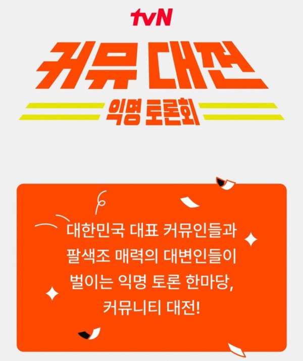 tvN이 국내 커뮤니티 유저들을 한 자리에 모은다. tvN은 30일 예능 공식 SNS 채널을 통해 ‘커뮤 대전 익명 토론회’ 개최 소식과 함께 참가자 공개 모집 소식을 알렸다. 해당 토론회는 가면을 쓴 커뮤니티 유저가 익명 채팅으로 토론에 참여하는 형태로, 대변인들이 각 커뮤인들을 대신해 토론을 진행한다. tvN 측은 디시인사이드, 보배드림, 여성시대,