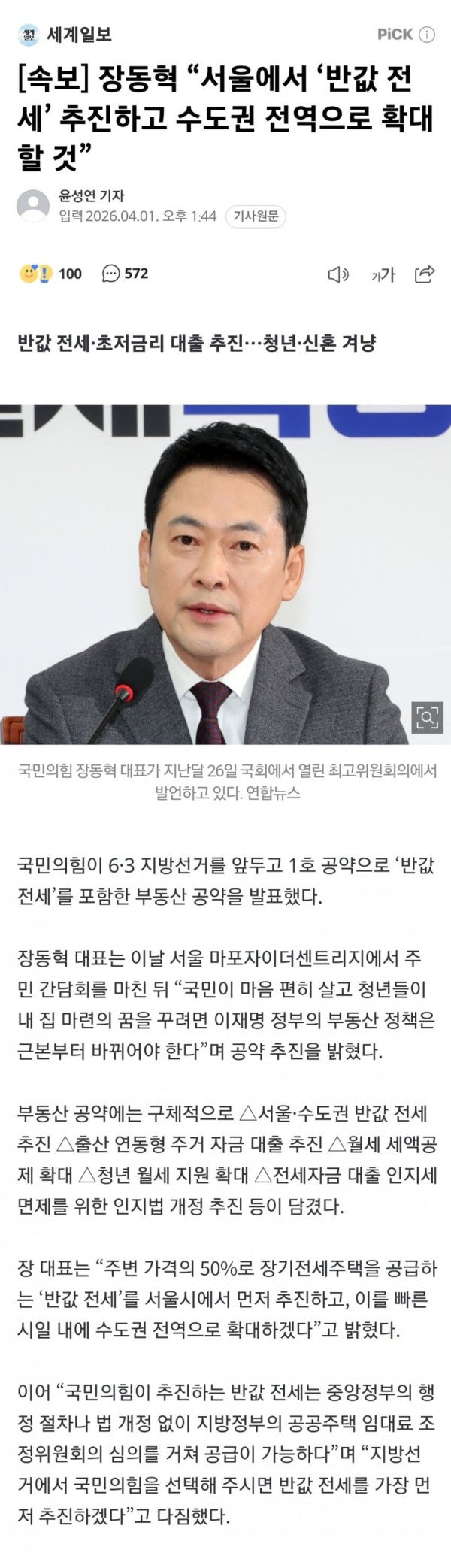 하지현 전상우 기자 = 국민의힘이 6·3 지방선거를 앞두고 1호 공약으로 '반값 전세'를 포함한 부동산 공약을 발표했다. 장동혁 대표는 이날 서울 마포자이더센트리지에서 주민 간담회를 마친 뒤 "국민이 마음 편히 살고