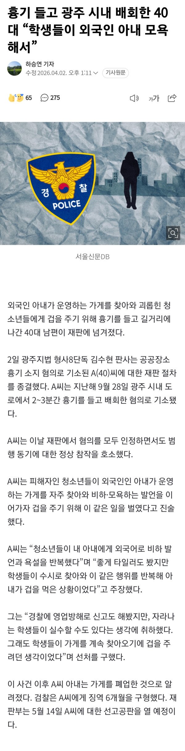 학생들이 외국인 아내 모욕해 흉기 들고 광주 시내 배회한 40대