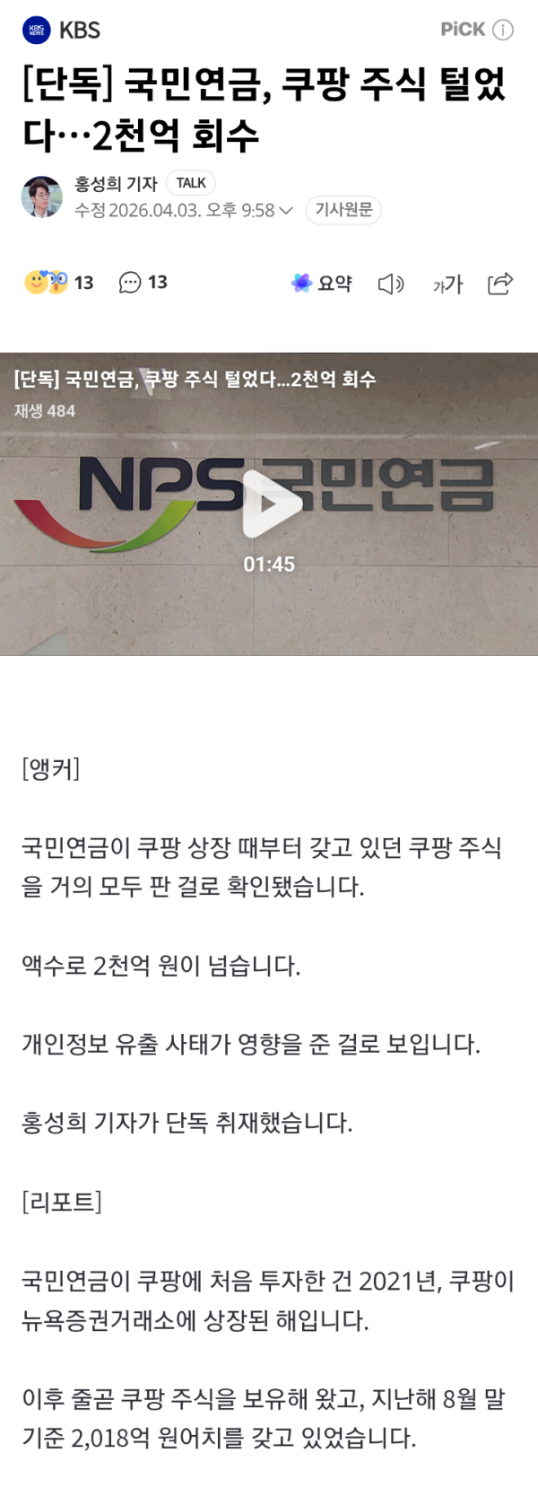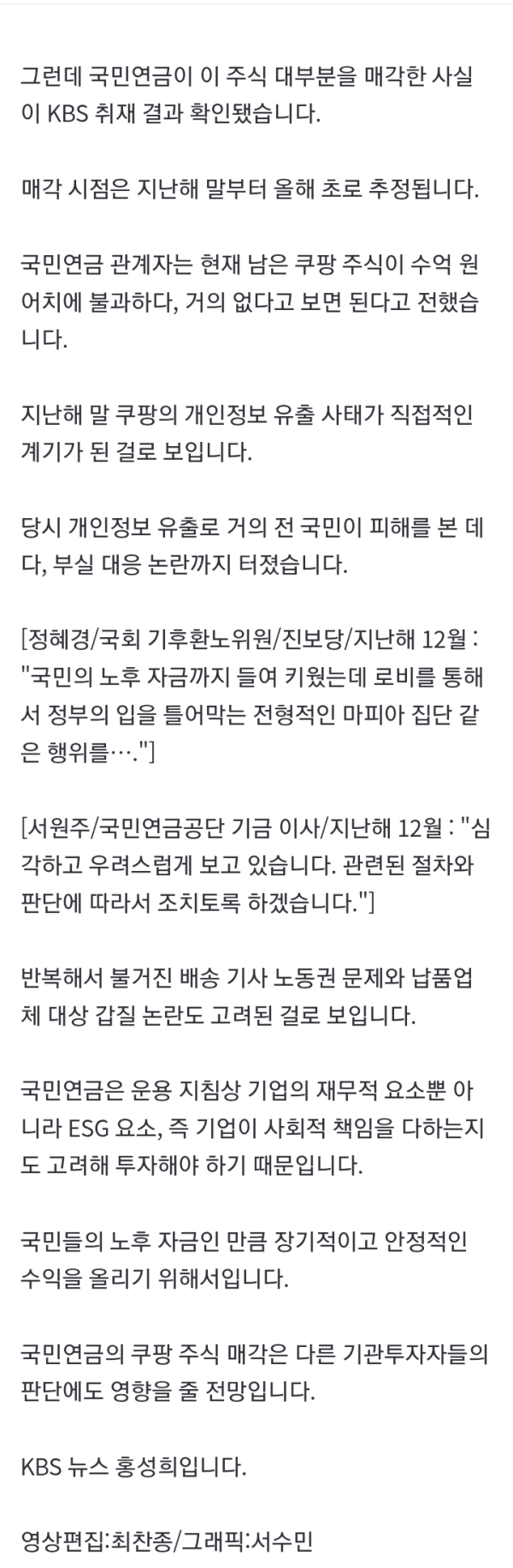 국민연금이 쿠팡 상장 때부터 갖고 있던 쿠팡 주식을 거의 모두 판 걸로 확인됐습니다. 액수로 2천억 원이 넘습니다. 개인정보 유출 사태가 영향을 준 걸로 보입니다. 홍성희 기자가 단독 취재했습니다. [리포트] 국민연