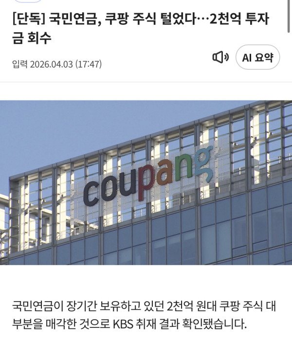 [단독] 국민연금, 쿠팡 주식 털었다…2천억 투자금 회수