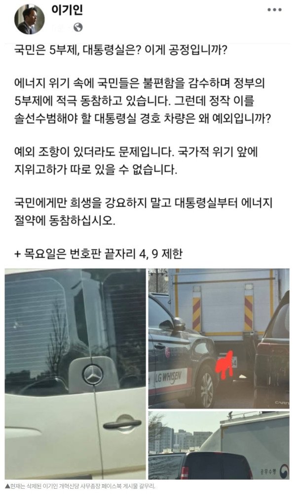 개혁신당 이기인, ‘靑 경호차량 5부제 위반’ 주장 ‘뭇매’