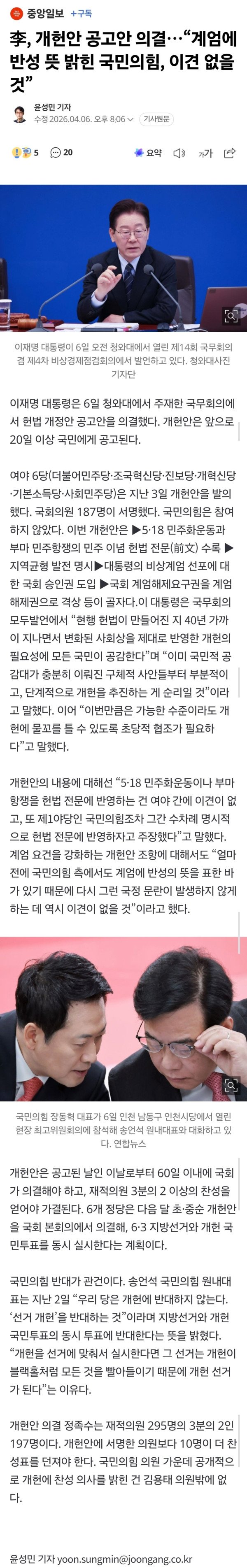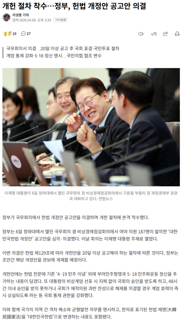 이재명 대통령은 6일 청와대에서 주재한 국무회의에서 헌법 개정안 공고안을 의결했다. 개헌안은 앞으로 20일 이상 국민에게 공고된다. 여야 6당(더불어민주당·조국혁신당·진보당·개혁신당·기본소득당·사회민주당)은 지난 3