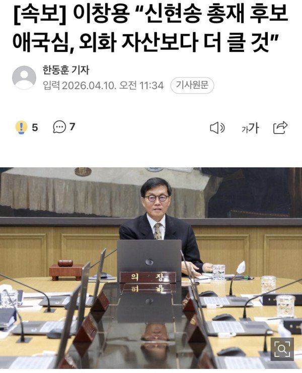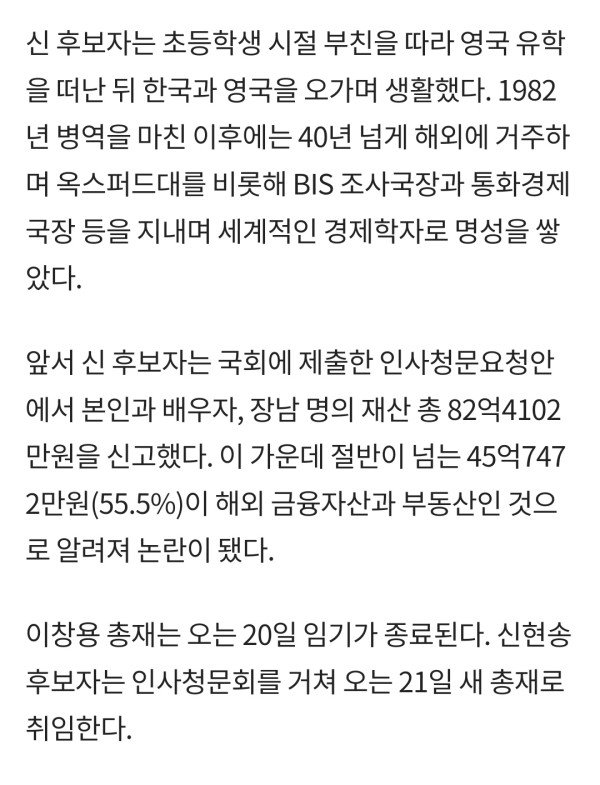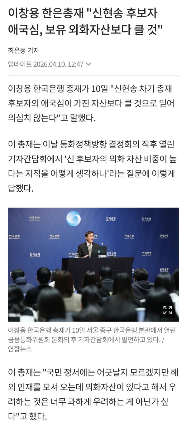 이창용 "신현송 후보자 애국심, 보유 외화자산보다 클 것"