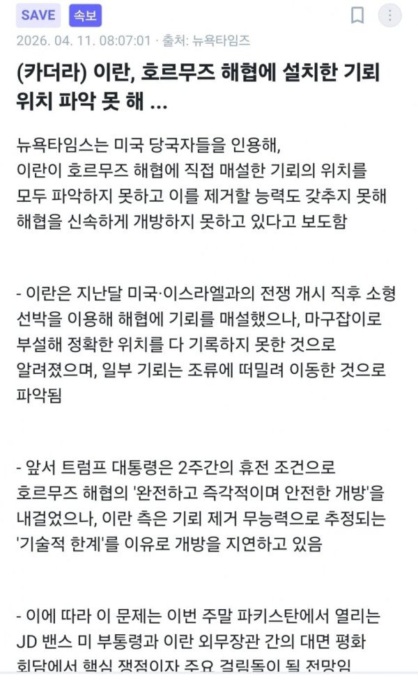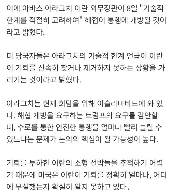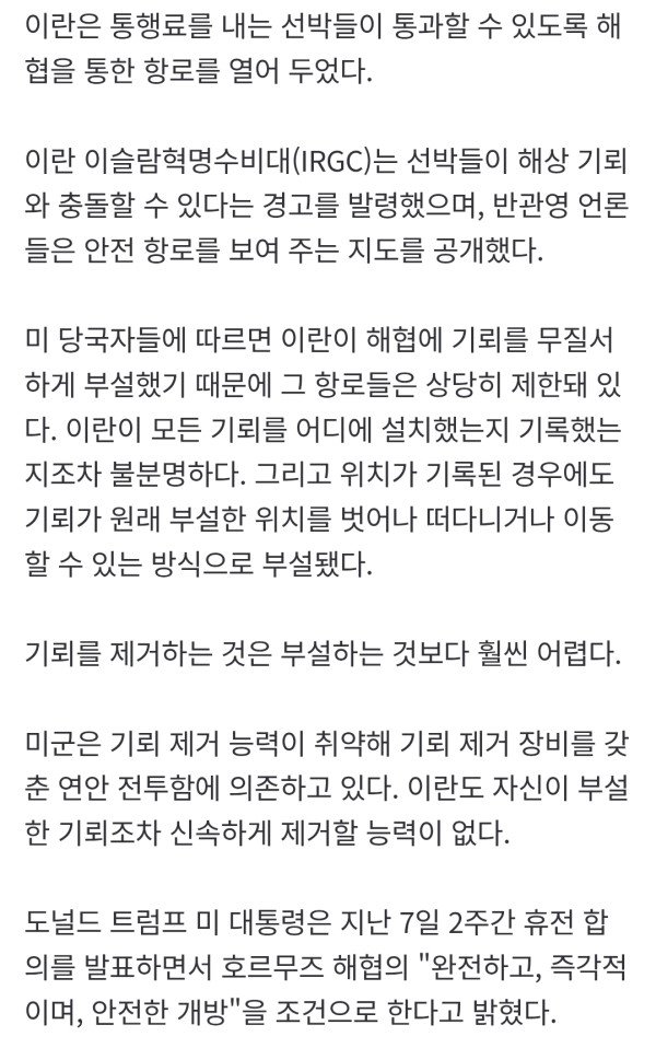 이란이 호르무즈 해협에 설치한 기뢰의 위치를 모두 파악하지 못하고 있으며 제거할 능력도 부족해 해협을 더 많은 선박 통행에 개방하지 못하고 있다고 미 뉴욕타임스(NYT)가 10일(현지시각) 보도했다. NYT는 호르무