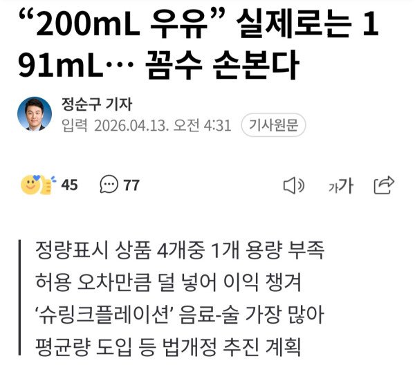 200mL 우유 실제로는 191mL… 꼼수 손본다