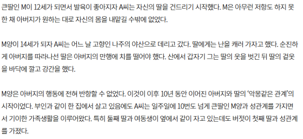 자신의 친동생은 24살이 되던 해에 성폭행했고 작은 딸은 19세가 되자 성폭행을 했으며 자기 기분이 내킬때마다