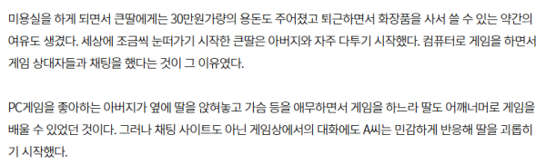 게임상에서 사람들과 게임을 하게되면서 필수적인 채팅을 하게 되면서 채팅을 했다는 이유만으로 큰딸을 더욱더 괴롭힌다.