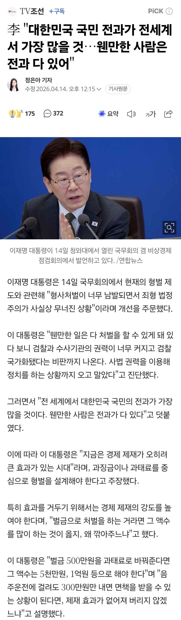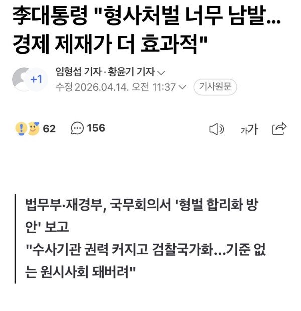 이재명 대통령은 14일 국무회의에서 현재의 형벌 제도와 관련해 "형사처벌이 너무 남발되면서 죄형 법정주의가 사실상 무너진 상황"이라며 개선을 주문했다. 이 대통령은 "웬만한 일은 다 처벌을 할 수 있게 돼 있다 보니