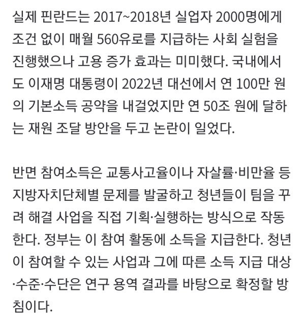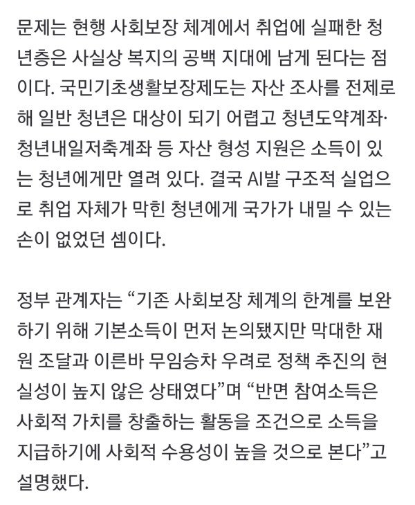 정부가 청년 참여소득 지급을 추진하고 나선 배경에는 인공지능(AI)이 인간의 노동을 대체하면서 청년층이 직격탄을 맞을 수 있다는 위기감이 자리 잡고 있다. AI가 경제성장을 견인하지만 막상 소득으로 이어지지 않는 이