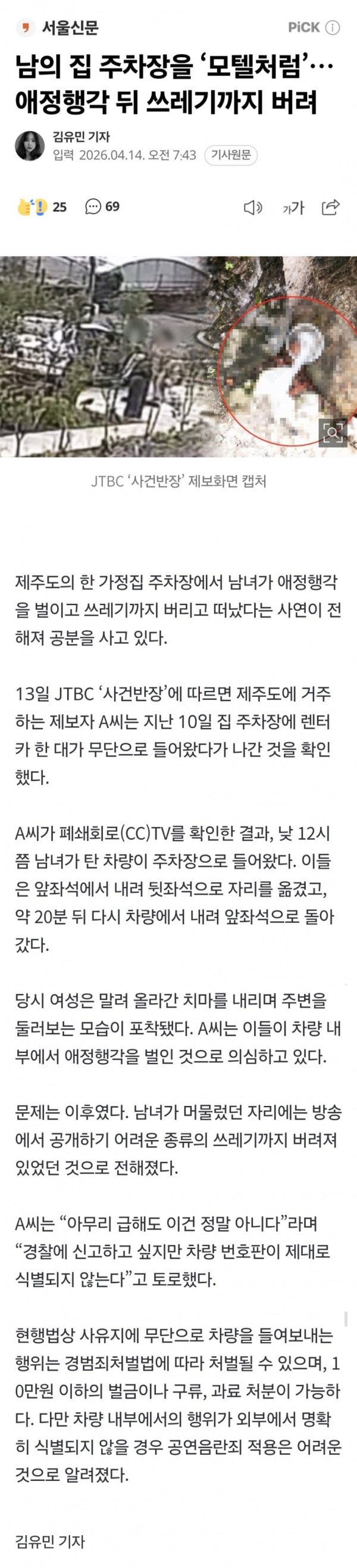 · 남의 집 주차장을 모텔처럼 쓴 커플· "렌터카, 집 주차장에 한참 있다 사라져"· 제보자 "남녀, 뒷좌석으로 가서 안 나와"· "주차장에 이런저런 쓰레기까지 버려"· 제보자 "집 주차장 앞은 2차선 도로다"· 제보자 "아무리 급해도, 지킬 건 지켜야"· CCTV 속 번호판 식별...