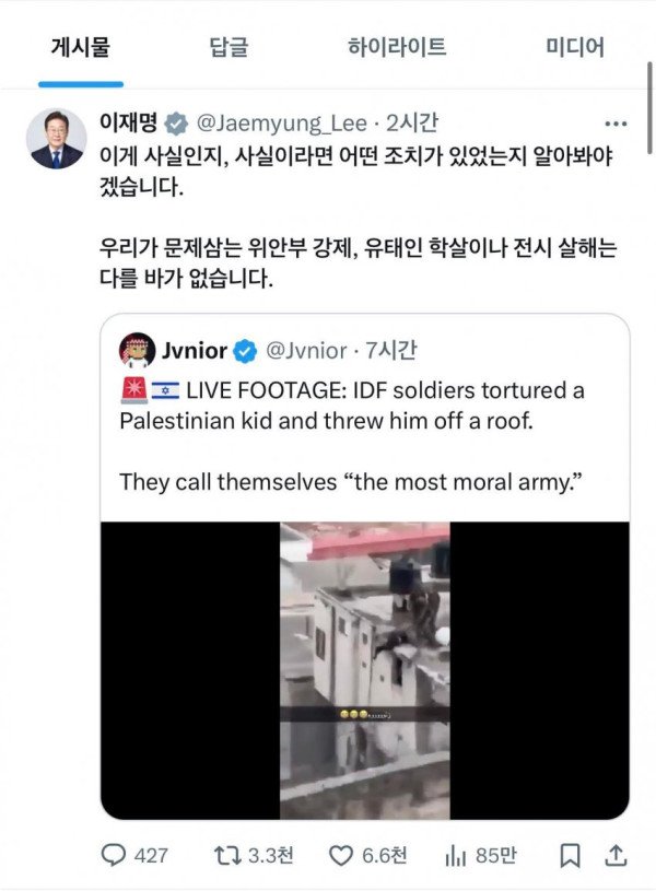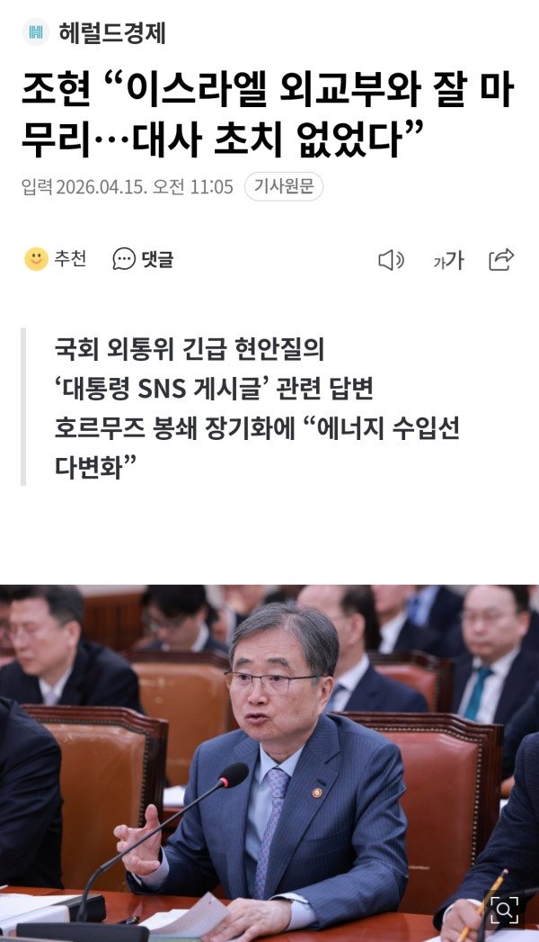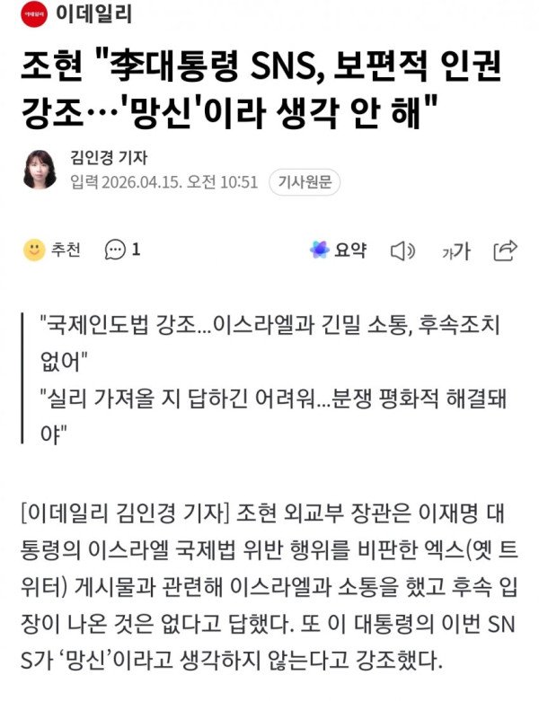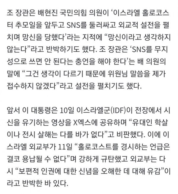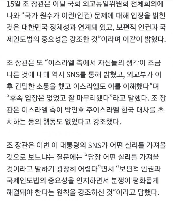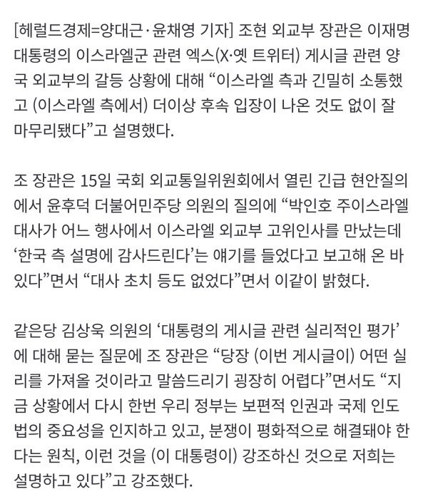 조현 외교부 장관은 이재명 대통령의 이스라엘 국제법 위반 행위를 비판한 엑스(옛 트위터) 게시물과 관련해 이스라엘과 소통을 했고 후속 입장이 나온 것은 없다고 답했다. 또 이 대통령의 이번 SNS가 ‘망신’이라고 생