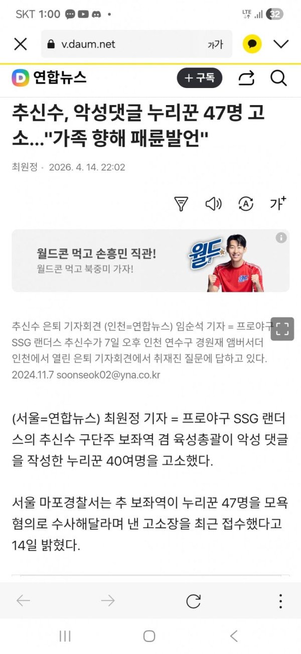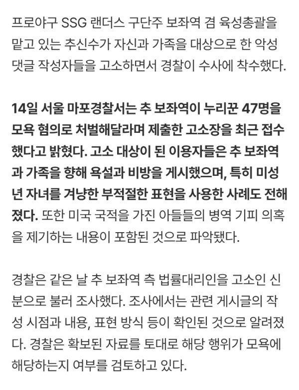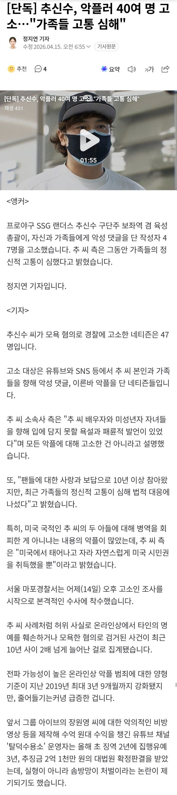 프로야구 SSG 랜더스 추신수 구단주 보좌역 겸 육성총괄이, 자신과 가족들에게 악성 댓글을 단 작성자 47명을 고소했습니다. 추 씨 측은 그동안 가족들의 정신적 고통이 심했다고 밝혔습니다. 정지연 기자입니다. <기자