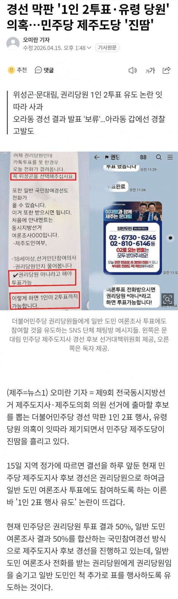 경선 막판 '1인 2투표·유령 당원' 의혹 민주당 제주도당 '진땀