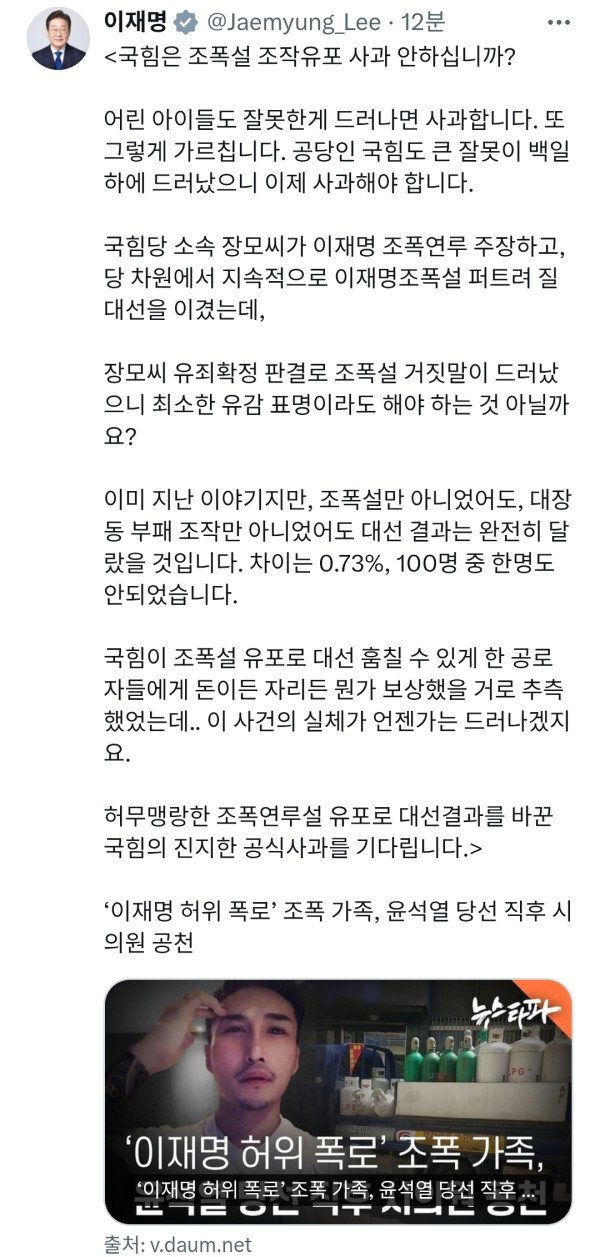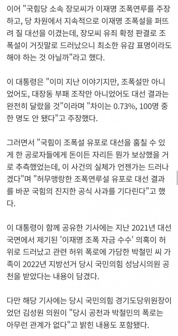 李 "국힘, 조폭설 조작유포 사과 안 하나…없었으면 대선 결과 달랐을것