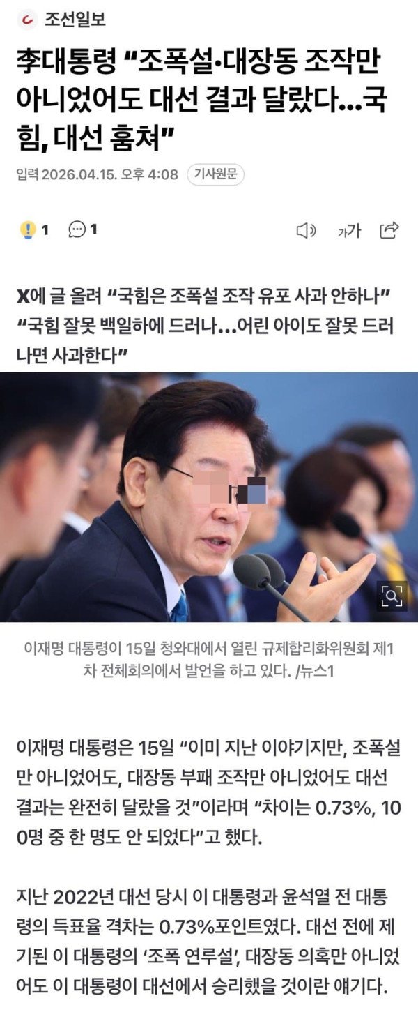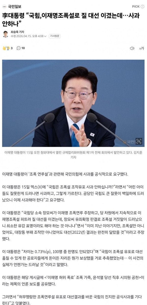 이재명 대통령이 15일 과거 자신을 겨냥한 이른바 '조폭 연루설' 허위 폭로와 관련해 국민의힘의 공식 사과를 촉구했다. 이 대통령은 이날 자신의 엑스(X·옛 트위터)에 '국힘은 조폭설 조작유포 사과 안하십니까'라는